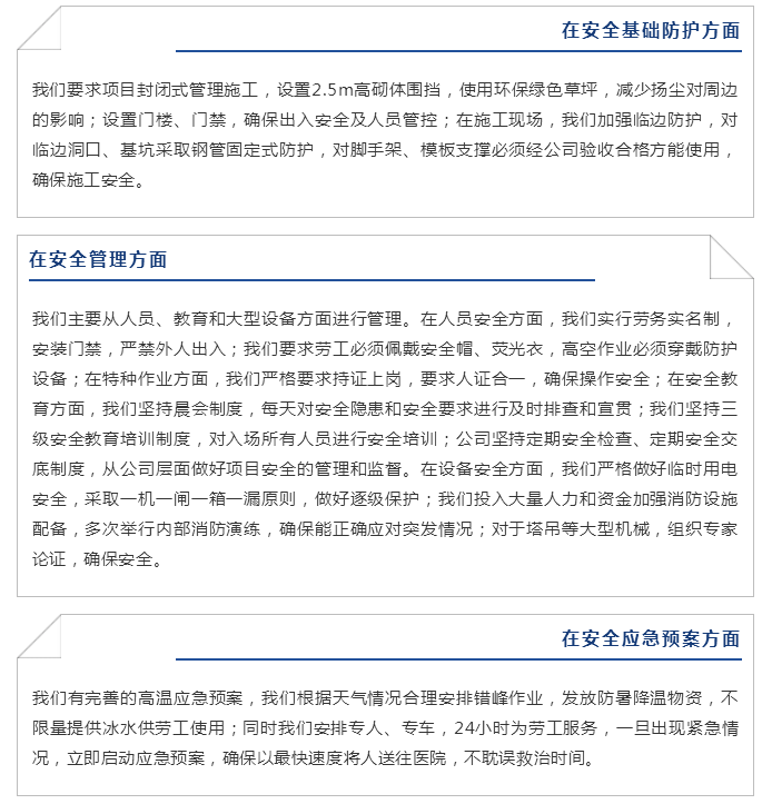 抓工程技術(shù),必須一絲不茍;抓工程進(jìn)度,必須一天不讓;抓工程質(zhì)量,必須一點(diǎn)情面不講;抓工程安全,必須一刻也不放松。這四個(gè)必須是集團(tuán)公司精益求精、鑄造精品的法寶。未來(lái),集團(tuán)公司將繼續(xù)將安全作為警鐘紅線,將品質(zhì)作為立業(yè)之本,全力做好每一個(gè)工程項(xiàng)目!